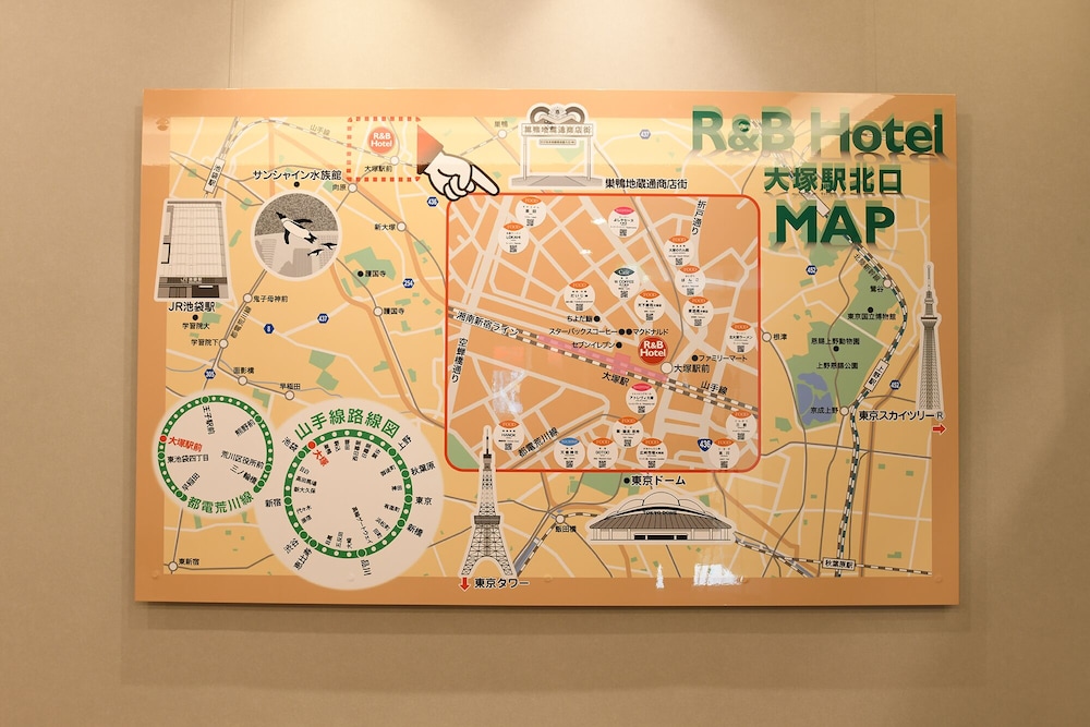 Located in Tokyo (Toshima), R&B Hotel Otsuka-eki Kita-guchi is within a 10-minute drive of Tokyo Dome and Tokyo Imperial Palace. This hotel is 5.4 mi (8.8 km) from Sensoji Temple and 6 mi (9.6 km) from Tokyo Skytree. Make yourself at home in one of the 259 air-conditioned rooms featuring refrigerators and LCD televisions. Complimentary wired and wireless internet access keeps you connected, and digital programming provides entertainment. Bathrooms with shower/tub combinations feature deep soaking bathtubs and rainfall showerheads. Conveniences include phones and desks, and housekeeping is provided daily. Distances are displayed to the nearest 0.1 mile and kilometer.