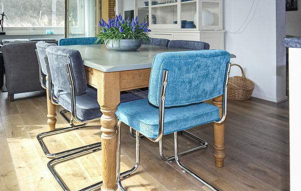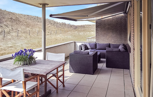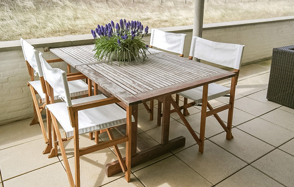 The large balcony (or rather terrace) has sun from midday and is accessible from the living room, but also from one of the two bedrooms. An ideal spot to enjoy the sun with a view of the dunes, overgrown with beach grass.