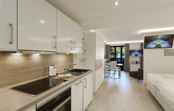 The sofa in the living area can be converted into two more comfortable beds if required. The spacious kitchenette is fully equipped with an induction hob and an oven with integrated microwave for your convenience. All other small kitchen appliances such as a kettle, toaster, coffee machine, Nespresso machine etc. are of course also available.