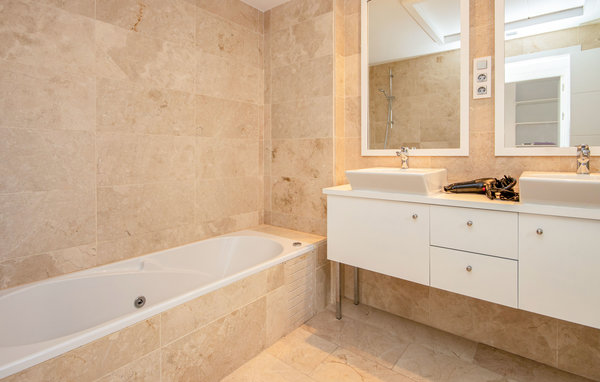 The master bedroom offers a super king-size bed and has a walk-in closet and an en suite bathroom. The guest bedroom is furnished with a king size bed and a bunk bed for 2 people. The bedroom has built-in wardrobes and has use of the guest bathroom. Both bedrooms offer access to the terrace.