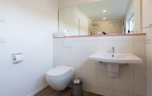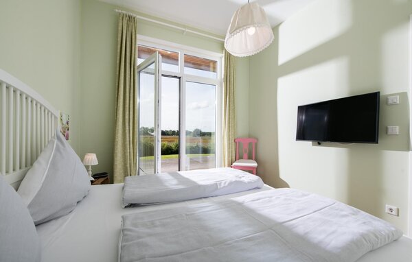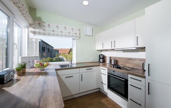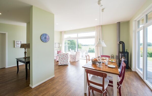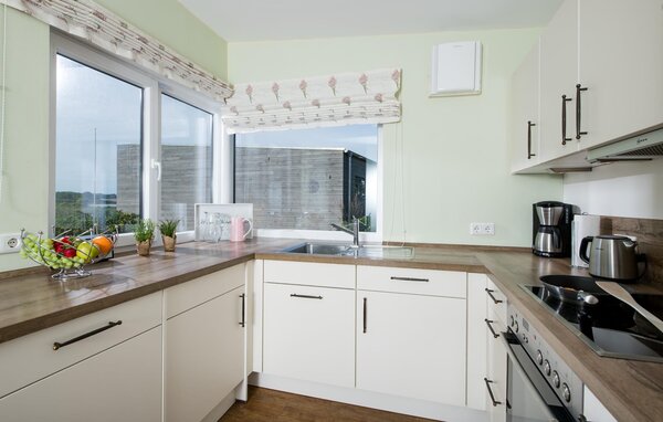 High ceilings and huge window fronts characterise the interior of the holiday home. While the open-plan kitchen offers all the amenities of high-quality equipment, a solid dining table and the spacious living room with stove invite you to linger.