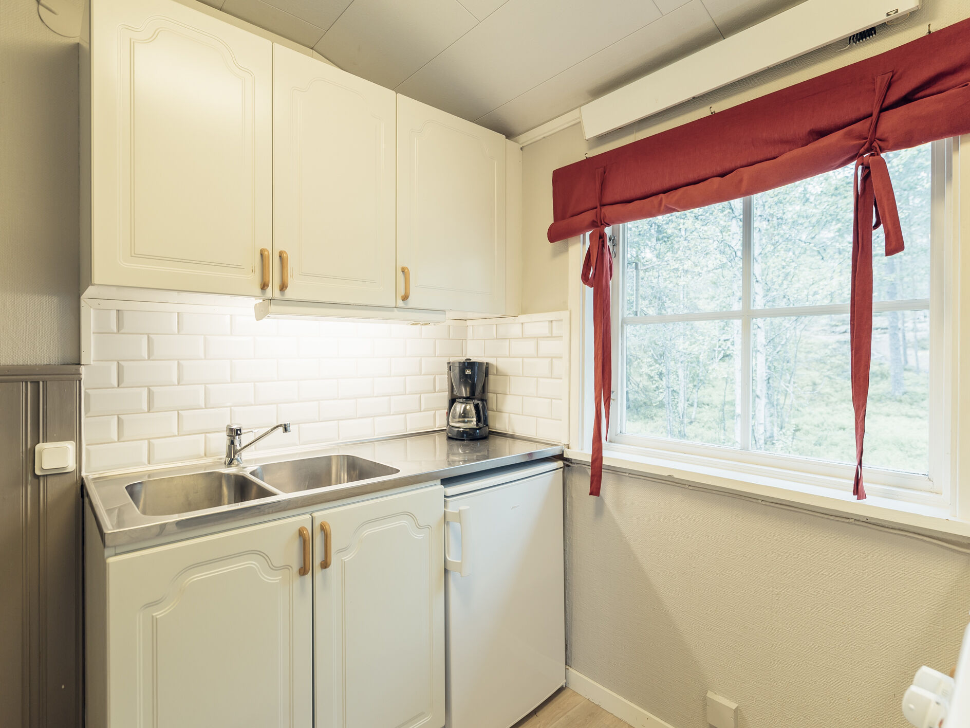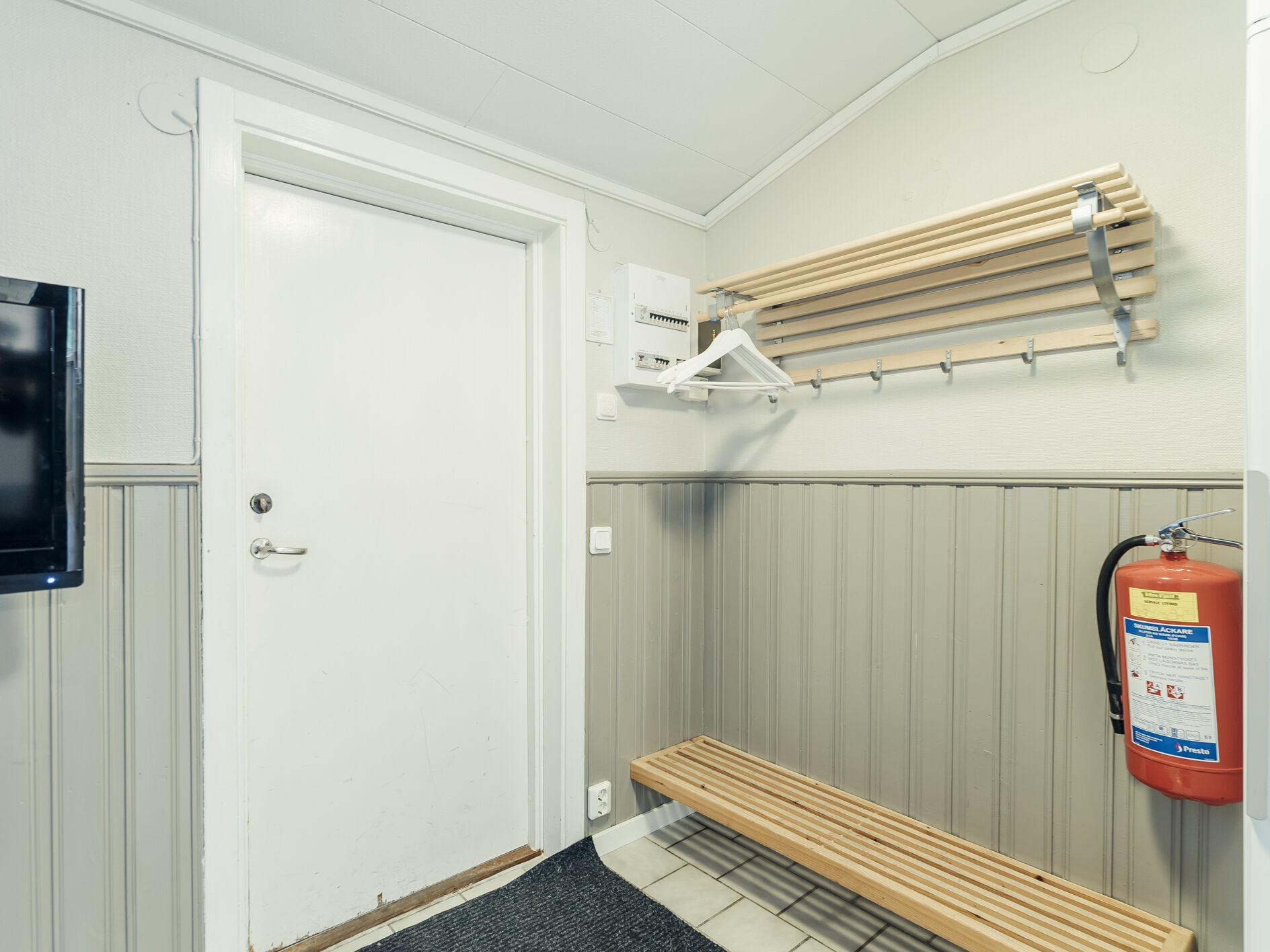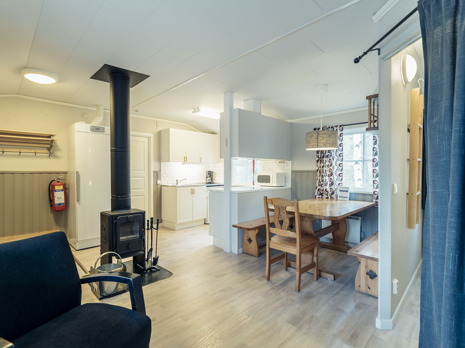 Cozy, log cabin accommodation suitable for up to 6 guests. The cabin features an open floor plan with a kitchen area, dining space, and a TV corner. Enjoy a relaxing fire in the wood stove after a day of activities. The cabin has two sleeping alcoves. Sleeping Alcove 1 includes two single beds and two fold-down wall beds. Sleeping Alcove 2 has one single bed and one fold-down wall bed. The kitchen is equipped with a stove, microwave, and refrigerator with a freezer compartment. There is a bathroom with a toilet and shower. Outside, you’ll find electrical outlets suitable for engine block heaters and secure storage for outdoor equipment. Smoking and pets are not allowed. Charging of electric vehicles is only permitted at designated charging stations.