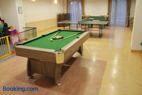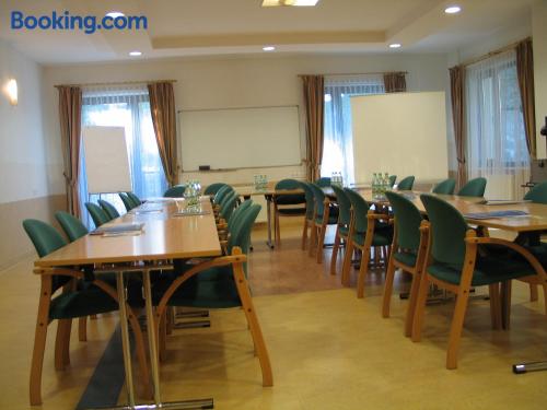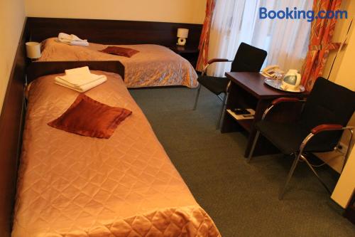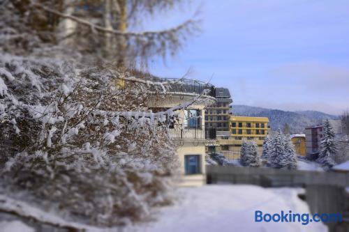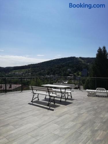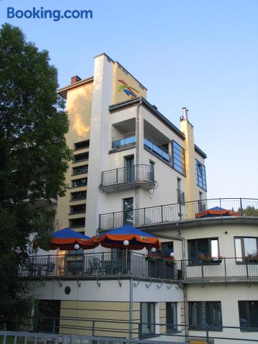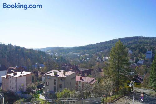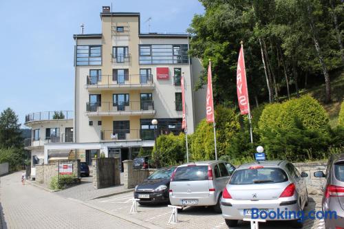 Farys - centrum Krynicy na wzgórzu wśród ciszy ze wspaniałymi tarasami widokowymi, sauna, jacuzzi, siłownia, prywatny parking za darmo dla naszych Gości is located in Krynica Zdrój and offers a restaurant, as well as free WiFi. The property is located 2 km from the Krynica Zdrój Train Station and 700 metres from the Henryk Ski Lift.Each apartment features a flat-screen TV with satellite channels, as well as a bathroom with either a bath or a shower. Extras include an electric kettle, bed linen and towels.Guests can benefit from a 24-hour front desk and banquet facilities. There is also a hot tub, a shared lounge, a games room and a terrace. The property offers ski equipment hire and bicycle rental.Farys - centrum Krynicy na wzgórzu wśród ciszy ze wspaniałymi tarasami widokowymi, sauna, jacuzzi, siłownia, prywatny parking za darmo dla naszych Gości is located 850 metres from Spa Parki in Krynica Zdrój and 1.9 km from Ski Lift Jaworzyna. The Słotwiny Arena is 3 km away.Please inform Farys - centrum Krynicy na wzgórzu wśród ciszy ze wspaniałymi tarasami widokowymi, sauna, jacuzzi, siłownia, prywatny parking za darmo dla naszych Gości in advance of your expected arrival time. You can use the Special Requests box when booking, or contact the property directly with the contact details provided in your confirmation.The property is accessed via Profesora Henryka Świdzińskiego Street.Sauna, Jacuzzi and gym are free for our guests.