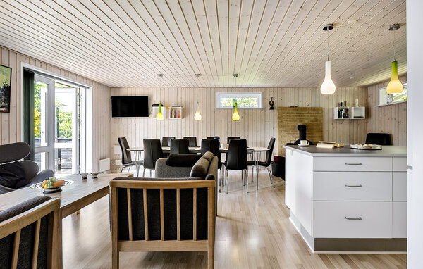 Your holiday home welcomes you with a cosy atmosphere and well thought-out furnishings. The interior impresses with its cosy wood panelling. Relax on the sofa, read a book or get together for a games evening by the crackling wood-burning stove. Cook together in the open-plan kitchen and enjoy your meals at the inviting, long dining table with room for the whole family.