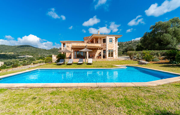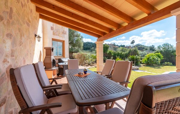 If you want to spend your special family holiday in the countryside, then Villa Inspiracion is the right place for you. The house truly deserves its name, and not just because of its inspiring, peaceful location in the southern Mallorcan countryside. Even the driveway lined with palm trees is a real eye-catcher. The bay windows, gables, balconies and terraces in combination with rustic brickwork unite classic Mediterranean architecture and the flair of an art nouveau villa. Inspiracion is an architectural jewel that will immediately inspire you. The crystal-clear pool is surrounded by a spacious lawn, ideal for sunbathing. The lawn also offers plenty of space for leisure activities such as badminton or boccia. Your children will be happy. A large garden borders the lawn. The beautiful garden is bordered by low walls and features palm trees, agaves and shrubs. The Mediterranean plants further emphasise the exceptional green ambience of the property. Both covered outdoor terraces are equipped with new wooden furniture. Your snack, which you have prepared on the brick BBQ grill, tastes twice as good while you gaze out over the palm trees of your villa towards the hills of Serres de Llevant.