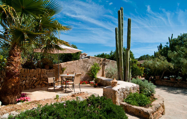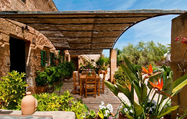 Historic estate on red soil, animal-loving farm, idyllic almond tree villa, comfortable and sociable agroturismo accommodation: it is clear that these descriptions apply to the red farm Es Rafal Roig with its main house made of natural stone and three small outbuildings. There are a whopping 350,000 square metres of lush flowers and greenery to discover, with many details that will delight young and old alike. There are cosy corners surrounded by cacti, palm trees, fragrant oleander and countless planted terracotta pots, water from the farm's own deep well, solar energy and guinea pigs, donkeys, chickens, geese and tortoises living in their own territory. While the grown-ups relax by the 10 metre long, centrally located pool, the little ones can splash around in their own pool behind the stone wall, which you can keep a wonderful eye on from the sun loungers. Playgrounds with large and small slides, sandpits and equipment for all kinds of ball games ensure there's never a dull moment and you can also watch the farming. Chairs and tables are scattered everywhere in sunny and shady spots where guests can have a picnic or chat. The small barbecue hut, an original from the old days, can be used every day and shares the space with the outdoor toilet and shower.