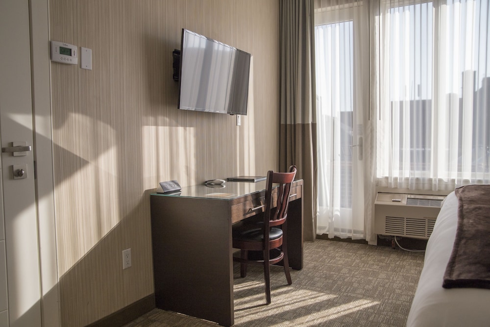 When you stay at Aura Hotel Brooklyn in Brooklyn, you'll be near the airport, within a 5-minute drive of Brooklyn Bridge and Barclays Center Brooklyn. This aparthotel is 3.7 mi (6 km) from Wall Street and 3.9 mi (6.3 km) from New York University. Make yourself at home in one of the 35 guestrooms, featuring kitchenettes with refrigerators and microwaves. Wired and wireless internet access is complimentary, while 55-inch flat-screen televisions with cable programming provide entertainment. Conveniences include laptop-compatible safes and desks, as well as phones with free local calls. Distances are displayed to the nearest 0.1 mile and kilometer.