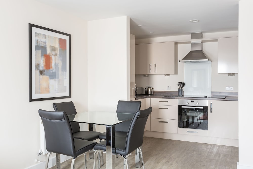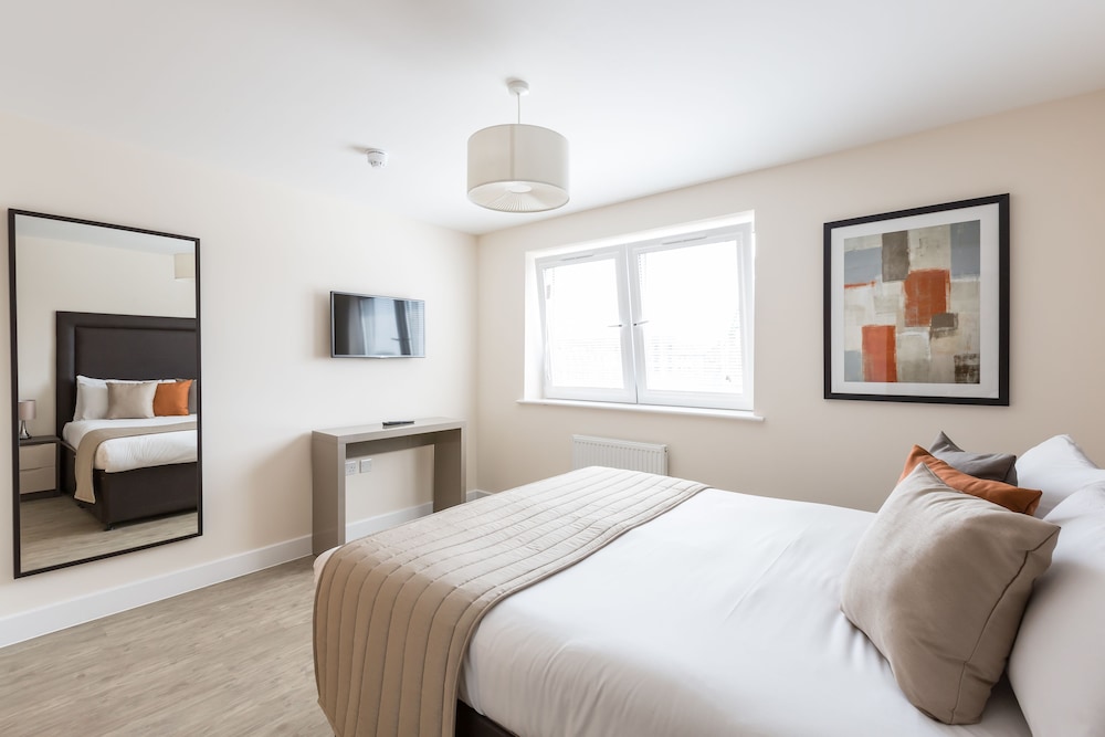 With a stay at Central Gate Apartments by House of Fisher in Newbury, you'll be within a 10-minute walk of Newbury Town Hall and Kennet & Avon Canal. This apartment is 8.6 mi (13.9 km) from Highclere Castle and 17.7 mi (28.5 km) from Thames River. Make yourself at home in one of the 12 guestrooms, featuring kitchens with refrigerators and ovens. 55-inch Smart televisions with digital programming provide entertainment, while complimentary wireless internet access keeps you connected. Conveniences include desks and microwaves, and housekeeping is provided weekly. Distances are displayed to the nearest 0.1 mile and kilometer.