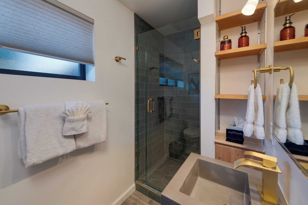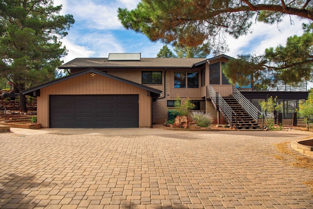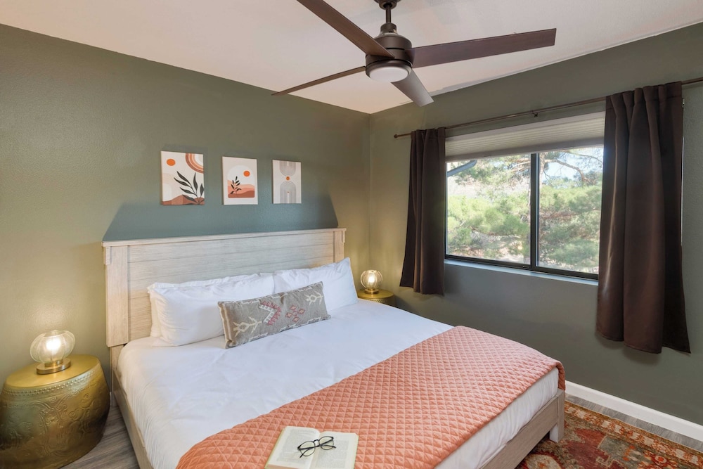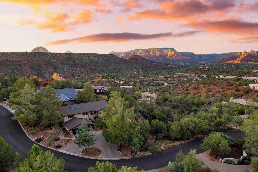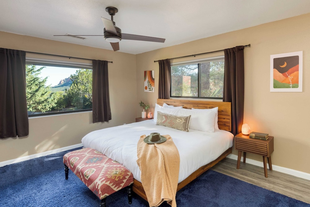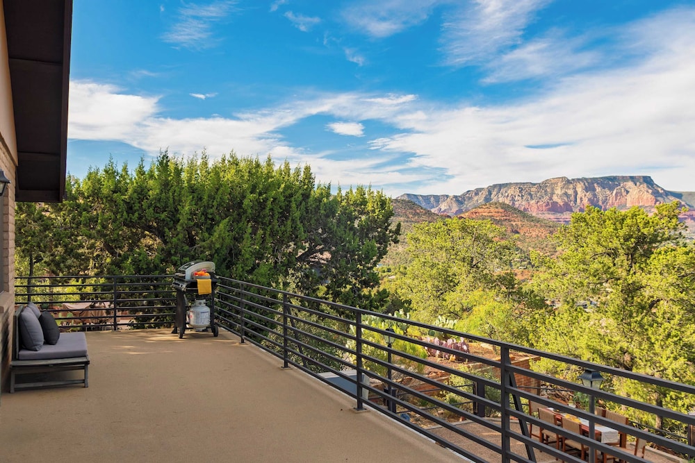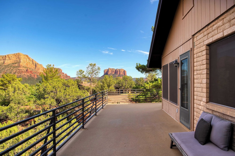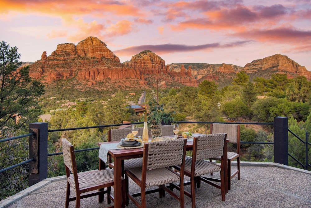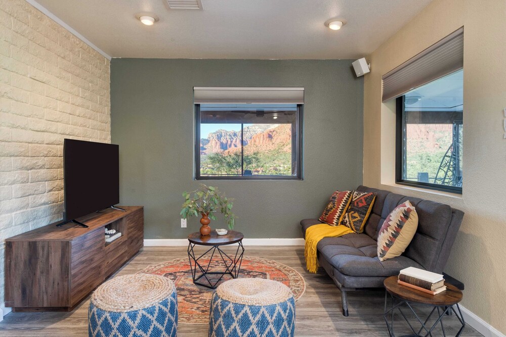 With a stay at Mid-century Gem w/ Views, Hot Tub & Sunroom Lounge Red Rock Haven by Avantstay in Sedona (Chapel), you'll be a 3-minute drive from Chapel of the Holy Cross and 7 minutes from Tlaquepaque Arts and Crafts Village. There's a private balcony. A kitchen is outfitted with a refrigerator, an oven, and a stovetop. The bathroom has a shower.Conveniences include a desk and a microwave. Distances are displayed to the nearest 0.1 mile and kilometer.