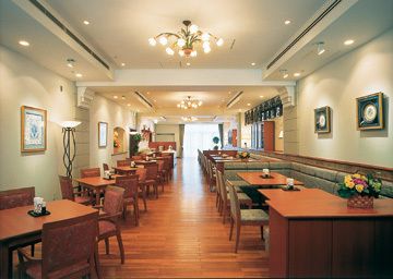 The lobby is small but filled with sunlight from two big windows. The interior decoration with light color marble creates elegant atmosphere. There is a small check-in counter and seating area, where guests can relax and read newspapers. A fresh flower arrangement is the focal point of the lobby area.