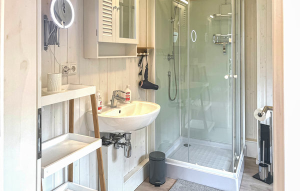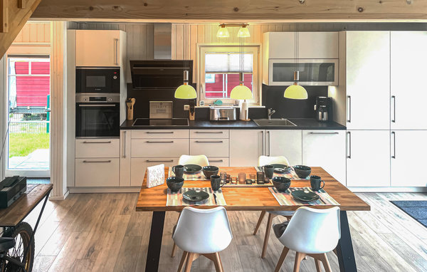 The harbour village of Zerpenschleuse is located in the north of Brandenburg, between water, meadows and forests. The holiday home is particularly bright and friendly thanks to the large panoramic windows. In the living room on the ground floor you can make yourself comfortable in front of the fire in the stove. Basic firewood equipment for the first day is already waiting for you. Unlimited WiFi, a Smart TV and a small stereo system provide entertainment. An ironing board and iron are also available for you.